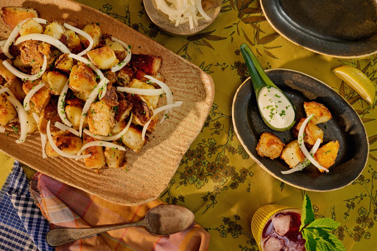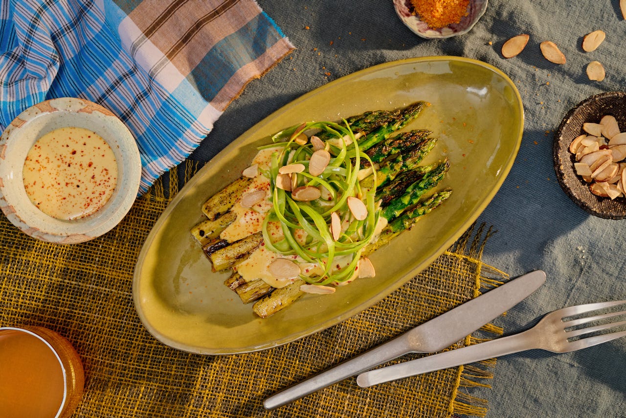 Sam, Lee, Isaac, Ari, and I did our first test shoot together the other day. Egoless passion projects with talented friends are always the best, but this one was especially inspiring and taught me so much about composition and thinking visually first. We made and enjoyed a long spring lunch with asparagus, potatoes, and soft scrambled eggs, as well as loads of condiments and garnishes (and herbs from our garden). The asparagus was probably my favorite, and it was also the most simple dish—peel it, toss it in olive oil, set it on a hot grill pan covered with a heat-proof bowl or lid to allow it to char and simultaneously cook through. Quickly mix together mayonnaise, dijon mustard, a little lemon juice/zest, and whatever seasonings your heart desires (we used Aleppo). Top it all with some toasted almonds and the perfect bite exists, again and again.